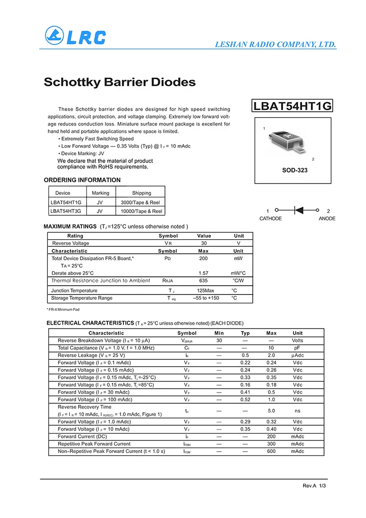 LBAT54HT1G JV SOD-323 30V/200mA Schottky Diode lot(20 pcs)
