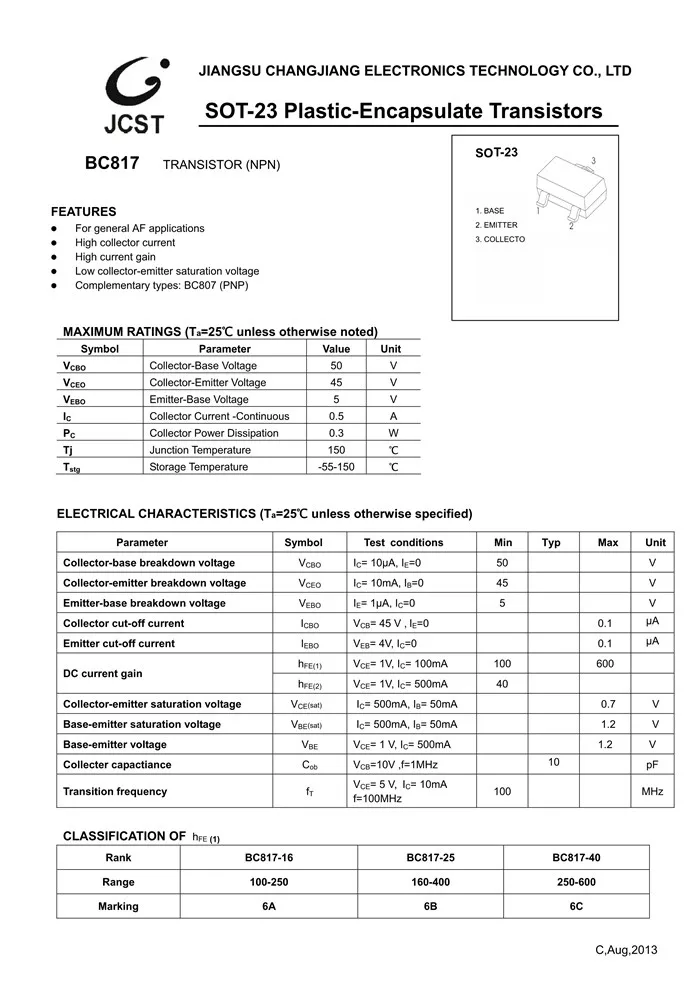 BC817-25 6B SOT-23 Triode Transistor NPN 45V/500mA lot(20 pcs)